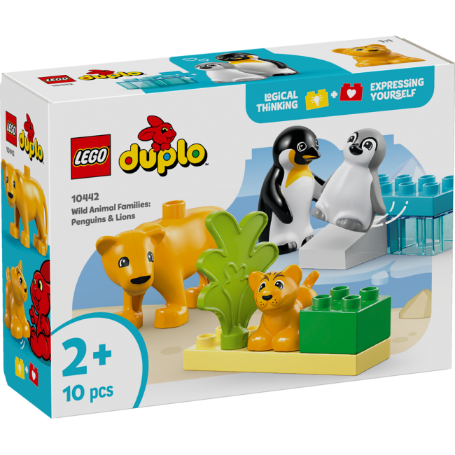Embark on a joyful learning journey with toddlers aged 2 plus as you take them from Antarctica to Africa with this cute nature-themed building toy. The Wild Animal Families: Penguins Lions (10442) imagination toy features 2 LEGO DUPLO penguinsand 2 lion toys for kids to inspire fun toddler games and hours of creative play.