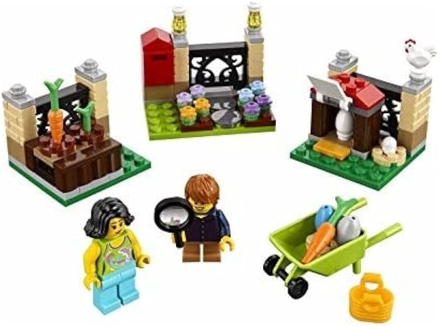 Features 3 locations, each with a fence panel: a henhouse with an opening door and rooster, flower garden with 2 lamps and mailbox, and a vegetable garden with a secret compartment, plus various buildable accessories and elements, including a wheelbarrow, magnifying glass, 3 eggs and a basket.