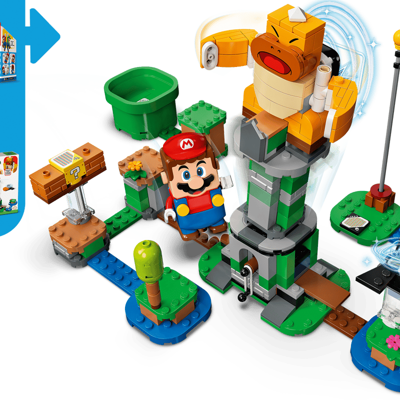 Features a buildable tower that is rocked by LEGO® Mario™ and/or LEGO® Luigi™ (figures not included) stomping on the levers at its base. Topple Boss Sumo Bro to reveal a Super Star Block.